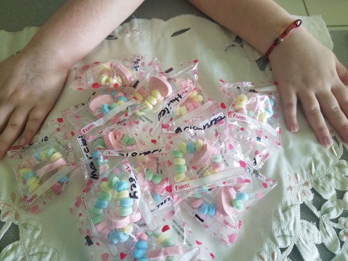 Hoy día veo el entusiasmo que Sofía Valentina le presta al famoso 14 de febrero y evoco la inocencia de aquellos años de infancia. Para ella es toda una ocasión porque es un día de fiesta en la escuela. Como ya está más grande se esmera en escoger la ropa casual que se pondrá y el peinado que se hará. Por supuesto, presta especial interés en los dulces que se comerá, en lo mucho que va a brincar y a bailar y en los detalles que le va a ofrecer a sus amigos, compañeros y maestras. Me toca entonces avalar su entusiasmo y lo hago con mucho gusto. Este año compramos pulseras de dulces que vienen en empaques individuales y con espacio para la dedicatoria.